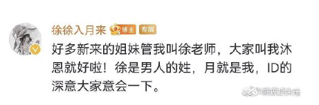 女主微博ID叫“徐徐入月来”。(好像现在已经改名了,所以不必去搜索了哈。至于取名理由,她自己在评论区提过。)