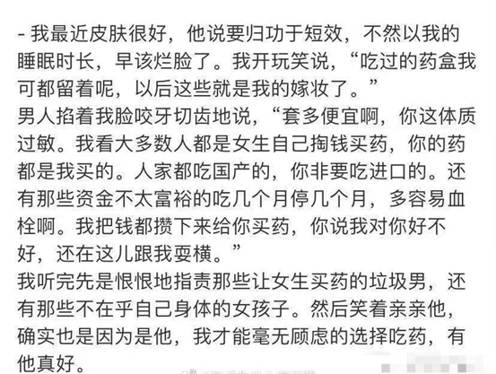 男的不想戴T让她吃药,强调是进口的,对她多么多么好。女生信了,发微博表示“因为是他,才能毫无顾忌的选择吃药,有他真好”。