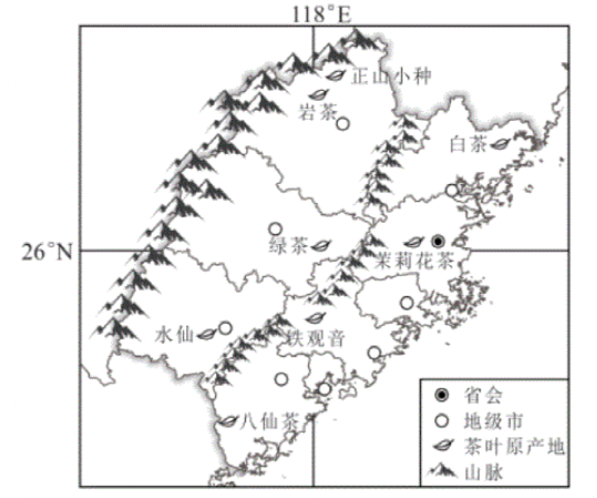 茶树喜温怕寒,喜雾怕晒,常栽种于气候湿润、排水良好的黄壤山区和丘陵。福建省是我国重要茶叶原产地,下图是福建省制茶品种分布图。读图,完成下面小题。
