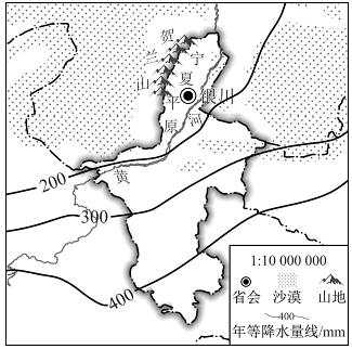 宁夏有民谣传唱:“宁夏川,两头尖,东靠黄河,西靠贺兰山;水浇田,金川、银川、米粮川。”示意下图宁夏年等降水量分布。读图,完成下面小题。