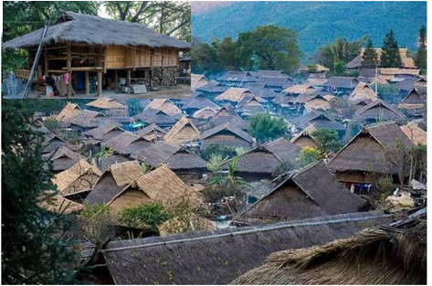 2021年2月14日,有“中国最后的原始部落”之称的云南省翁丁老寨不幸遭遇火灾,百余户房子只剩几户未被烧毁。读翁丁老寨及传统民居景观图,完成下面小题。
