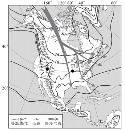 (2)甲地1月平均气温为________℃。和乙地相比,甲地气温更________,原因是________。