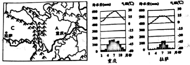 (3)夏季,重庆的气候特点是____,拉萨比重庆更凉爽的主要影响因素____。