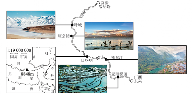 新疆某中学地理教师沿我国最长、平均海拔最高的国道G219 自驾旅行。下图示意国道G219路线及沿途停靠站景观。