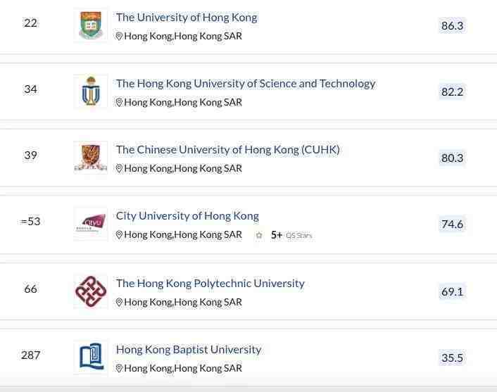 今年香港院校有5间位列全球前100位,分别是:香港大学(22位)、香港科技大学(34位)、香港中文大学(39位)、香港城市大学(53位)、香港理工大学(66位)。