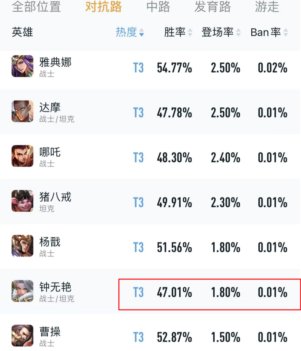 王者荣耀有一百多位英雄,真正热门的也就一半多一点,很多冷门英雄很少有人玩了,甚至有些绝活哥为了上分不得不练习几个版本强势英雄,这种现象从游戏上线后就一直存在。就拿对抗路来说,高端局永远都是老夫子、马超、关羽、吕布等一些开团或者突进的英雄,程咬金、钟无艳、曹操这种稍显笨重的英雄出场率太低了。游戏里的英雄理应百花齐放,这种现象策划也不希望看到,近期官方针对冷门英雄进行了加强,其中就有钟无艳。