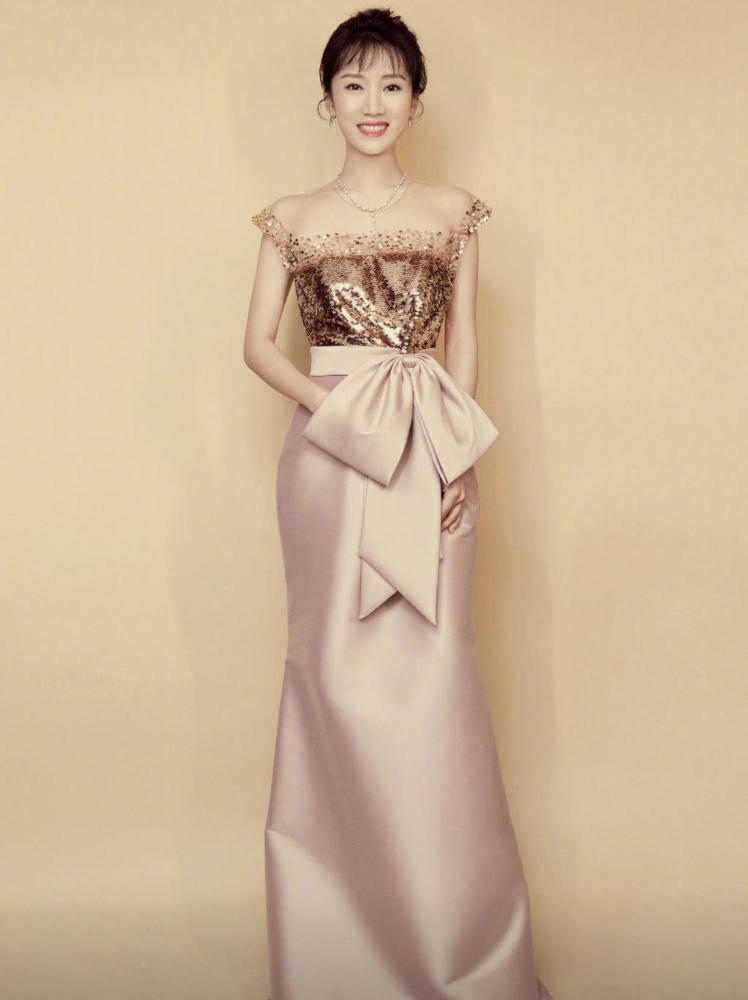 来看一张李念的现代装照片:头发蓬松盘于脑后,身穿亮片拼接蝴蝶结礼服,秀出优美的肩颈曲线,美丽温婉,高贵大气。