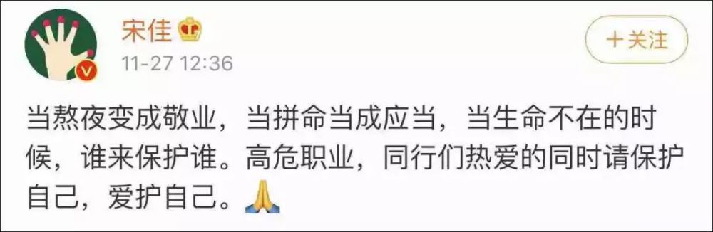 宋佳称,当熬夜变成敬业、拼命当成应当,当生命不在的时候,谁来保护谁,“高危职业,同行们请保护自己。”