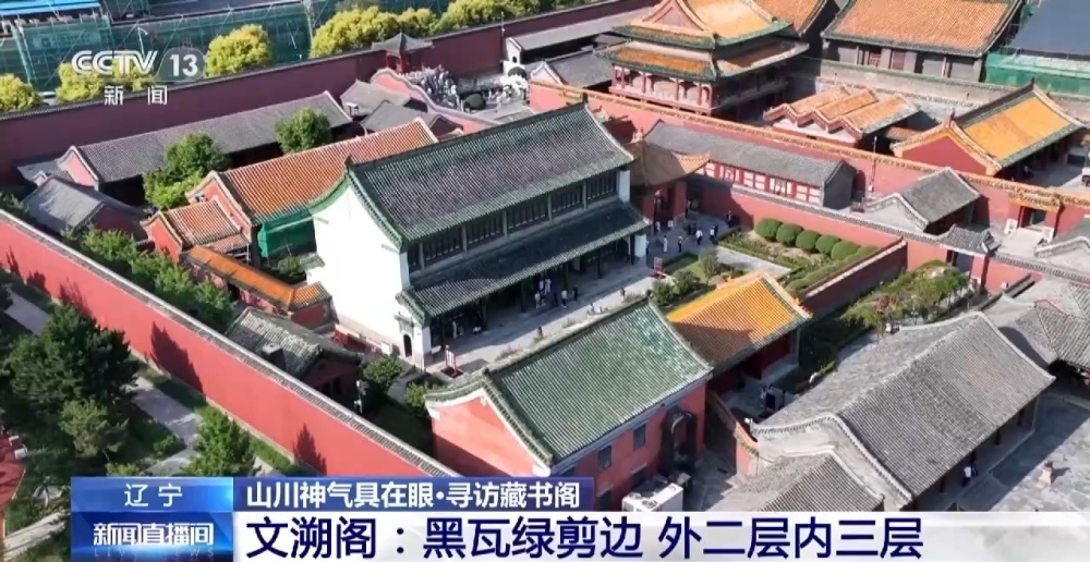 总台记者 杨雪:沈阳故宫的建筑色彩丰富、鲜明,从空中俯瞰,红色的宫墙上、黄色的琉璃瓦屋顶外围还有一层绿色的剪边,红、黄、绿构成了沈阳故宫建筑的主色调,而文溯阁却因为其独有的黑瓦绿剪边,让它成了沈阳故宫之中一道最为特别的风景。