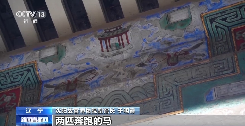 沈阳故宫博物院副馆长 于明霞:画的是白马负书这么一个故事,我们看这个彩画上两匹奔跑的马,它的背上是驮着书卷的,还有上面的亭子,里面放的也是书卷,包括这些祥云、海水当中都是书卷,底下是海水江崖,还有廊房上这些,我们画的直接看就是白和蓝为主色调的翰墨册页。