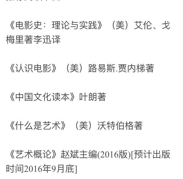 首先看一下官网的五本书《艺术概论赵斌版》、《什么是艺术》、《认识电影》、《电影史理论与研究》、《中国文化读本》,重点肯定是《艺术概论》,你会在考卷上找到9成的原题在书上面,但是只读这一本就够了吗?