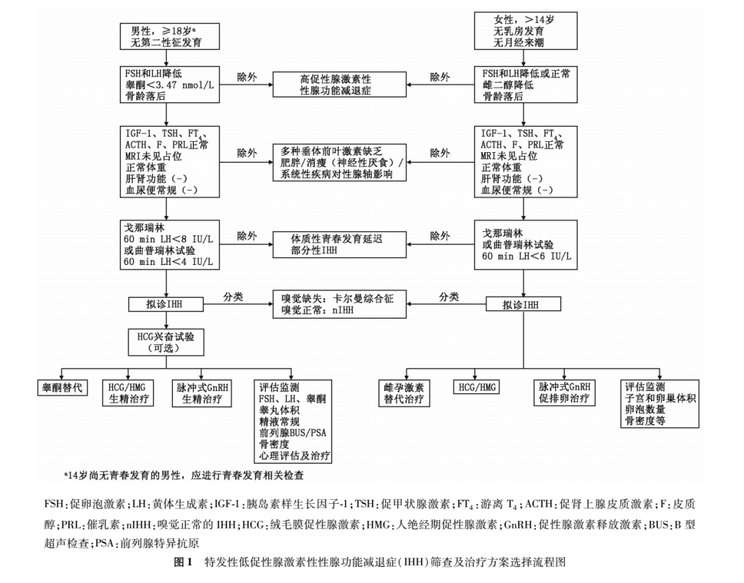 #5(1). IHH 的定义与分类因先天性下丘脑促性腺激素释放激素(GnRH)神经元功能受损,GnRH 合成、分泌或作用障碍,导致垂体分泌促性腺激素减少,进而引起性腺功能不足,又称为先天性低促性腺激素性性腺功能减退症(CHH)。临床根据患者是否合并嗅觉障碍将 IHH 分为两大类:伴有嗅觉受损者称为卡尔曼综合征(Kallmann syndrome); 嗅觉正常者, 称为嗅觉正常的 IHH(normosmic IH, IH)。IHH是一种临床罕见的内分泌疾病,国外数据显示IHH总体发病率 1/100000 ~ 10/100000,男女比例为 5:1。国内数据尚缺乏。(2). 病因IHH 的病因尚不明确,目前已明确有包括 KAL1、FGFR1、FGF8、GnRH 等二十余种基因突变可导致 IHH。(3). 临床表现① 第一性征不发育和配子生成障碍:男性表现为童声、小阴茎、无阴毛生长、小睾丸或隐睾、无精子生成;女性表现为乳腺不发育、幼稚外阴和原发闭经。② 骨骺闭合延迟,上部量/下部量 < 1,指间距 > 身高,易患骨质疏松症。③ 嗅觉障碍:因嗅球和嗅束发育异常,40% ~ 60% 的 IHH 患者合并嗅觉减退甚至丧失,不能识别气味。④ 其他表现:面中线发育缺陷,如唇裂、腭裂;孤立肾;短指(趾)、并指(趾)畸形;骨骼畸形或牙齿发育不良;超重和肥胖;镜像(连带)运动等。(4). 诊断标准男性骨龄 > 12 岁或生物年龄 > 18 岁,尚无第二性征出现和睾丸体积增大,睾酮水平 < 3.47 nmol/L(100 ng/dL),促性腺激素「促卵泡激素(FSH)和黄体生成素(LH)」水平低或正常;女性到生物年龄 14 岁尚无第一性征发育和月经来潮,雌二醇(E2)水平低且促性腺激素水平低或正常;且找不到明确病因者,拟诊断本病 [1]。图 6:IHH 筛查及治疗方案流程图图源:特发性低促性腺激素性性腺功能减退症诊治专家共识(2015 版)(5). 治疗对于男性 IHH 的治疗方案主要有三种:睾酮替代、促性腺激素生精治疗、脉冲式 GnRH 生精治疗 [1]。临床上不同方案的选择,要结合患者的年龄、下丘脑-垂体-性腺轴的功能状态、生育需求、经济状况等多种因素来决定。● 三种方案的特点:睾酮替代治疗可以促进男性化,使患者能够完成正常性生活和射精;促性腺激素治疗可促进自身睾丸产生睾酮和精子;脉冲式 GnRH 治疗通过促进垂体分泌促性腺激素而促进睾丸发育。