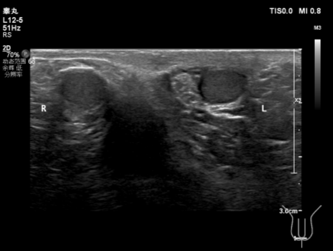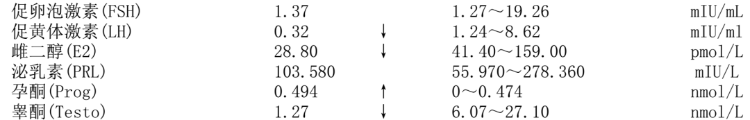 #4检查有条不紊地进行中,相关结果陆续回复,真相也逐渐露出了水面......● 小林的甲状腺功能未见明显异常,皮质醇、ACTH 节律基本正常,最重要的性激素结果显示:促黄体激素(LH)和睾酮水平都明显低于正常值,FSH 位于正常值下限。图 3:性激素六项结果 来源:作者提供● 睾丸彩超提示:双侧睾丸体积明显偏小。