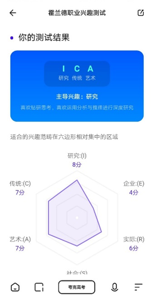 5. 报考的时候,一定要考虑未来的职业规划和个人性格。比如,你的性格适合体制内还是体制外?你想在哪个城市工作?你想做研究者还是执行者的工作等等。如果实在不知道自己喜欢学什么,想学什么,可以通过夸克APP的的职业性格测试,辅助自己做出选择。比如霍兰德职业兴趣测试、MBTI性格测试这两大权威测试,能够让大家了解自己与哪些专业和就业方向契合。