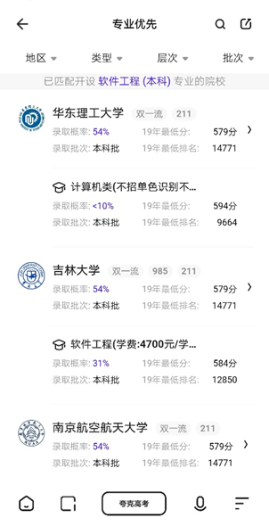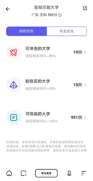 鉴于这种院校或专业的优先,考生可以用夸克APP的的【AI志愿服务功能】,理工科学生按照专业优先、文科专业学生按照院校优先维度来查看自己有哪些更合适的志愿选择。