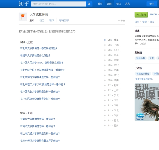知乎玩得熟的孩子估计都知道知乎有个专门的“大学就读体验”的话题(zhihu.com/topic/20005933)。这个话题覆盖了全国最主要的985、211高校。它的页面是这个样子的: