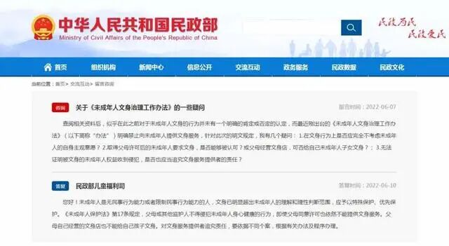 据民政部网站消息,民政部儿童福利司6月10日答复了网民关于《未成年人文身治理工作办法》的一些疑问,明确表示即使父母同意许可也依然不能提供文身服务,父母自己经营的文身店也不能给自己孩子文身。