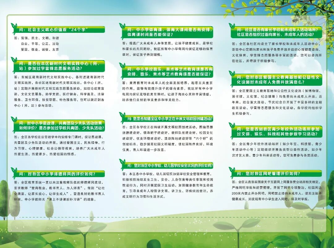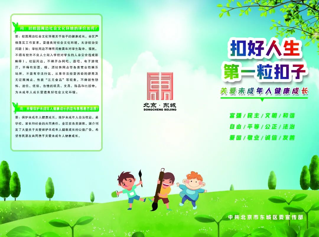 校园周边社会文化环境关乎孩子的健康成长。全区严格落实工作要求,营造良好社会文化环境,无涉校治安问题(如:学校周边不得有闲散青年对学生敲诈、骚扰,不得有校外不良人士闯入学校对学生的人身安全造成影响等),校园周边,不得开办网吧、酒吧、电子游戏厅,不得有彩票、烟、酒销售网点等各类营业性娱乐场所,不能有非法行医、从事非法经营活动的游商及无证照摊点、售卖“三无食品”等现象,不得销售恐怖、迷信、低俗、色情的玩具、文具、饰品和出版物,为未成年人成长营造良好社会文化环境。Q关爱保护未成年人健康成长的宣传氛围是否浓厚?A