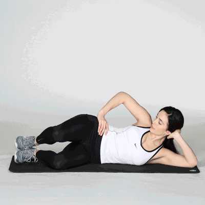屈膝侧卧于垫子上,用双臂手肘部位微微弯曲支撑身体;收紧腹部及下腰部并保持身体核心部位稳定不晃动。肩膀与髋骨应成一直线。稳定躯干,臀部发力将一侧腿部向外侧抬(膝盖弯曲的角度维持不变),感受臀部侧上方的发力。每组12-15次,重复3-5组。