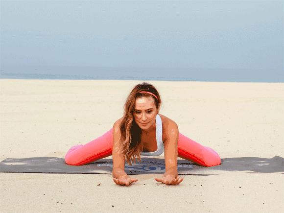 双膝最大幅度张开,全身放松前后移动臀部,找到拉伸感。臀部向后压,加大拉伸幅度。大腿内侧有明显牵拉感。