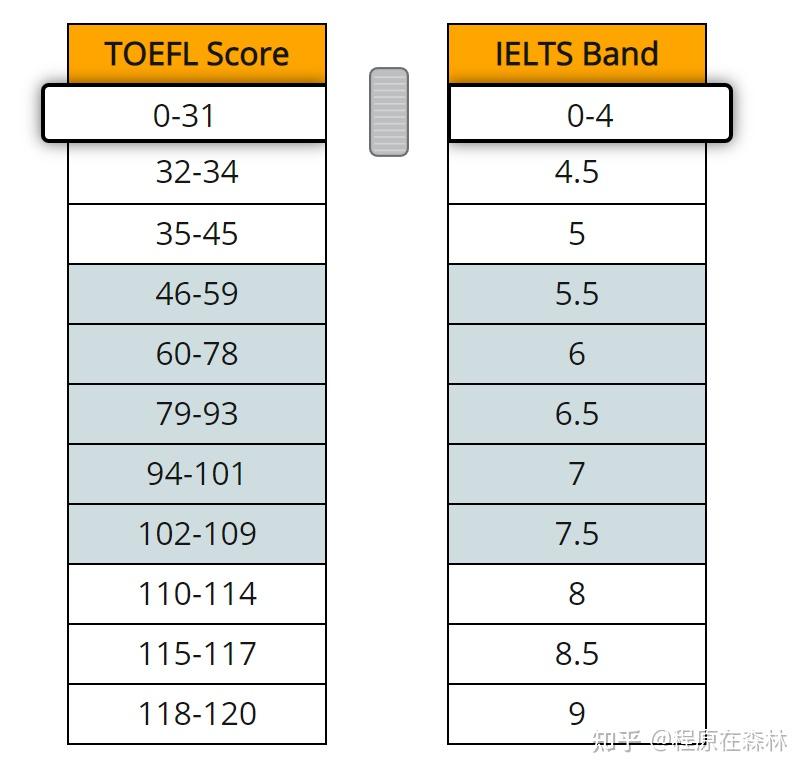 话再绕回来这张表,这张表比起托福雅思,中国学生会更不熟悉。用托福雅思来对比会更清楚,如果你要出国的话也可以作为你的参考: