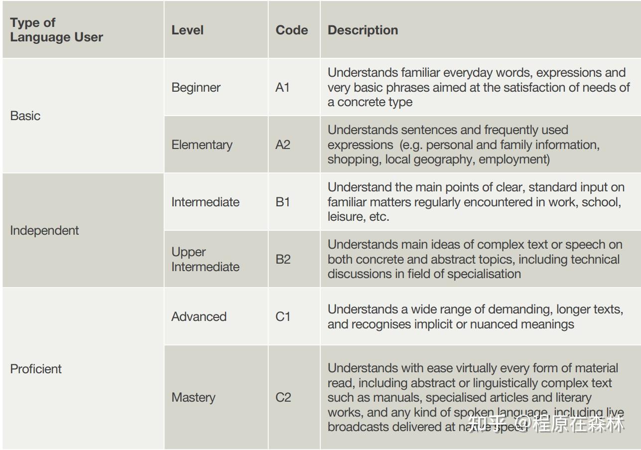 这张表是CEFR(Common European Framework of Reference for Languages )给出的对非母语者掌握的语言水平的一个详细的判断标准,也包括英语。这个标准经历了比较严格的学术检验,以及各种真人测试,算是比较贴合实际的。