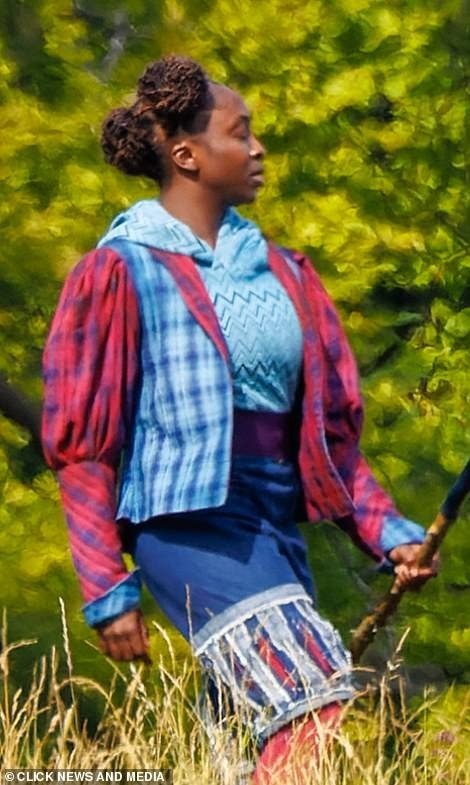 另一位黑人女演员穿着一套蓝色和粉色混搭的服装;