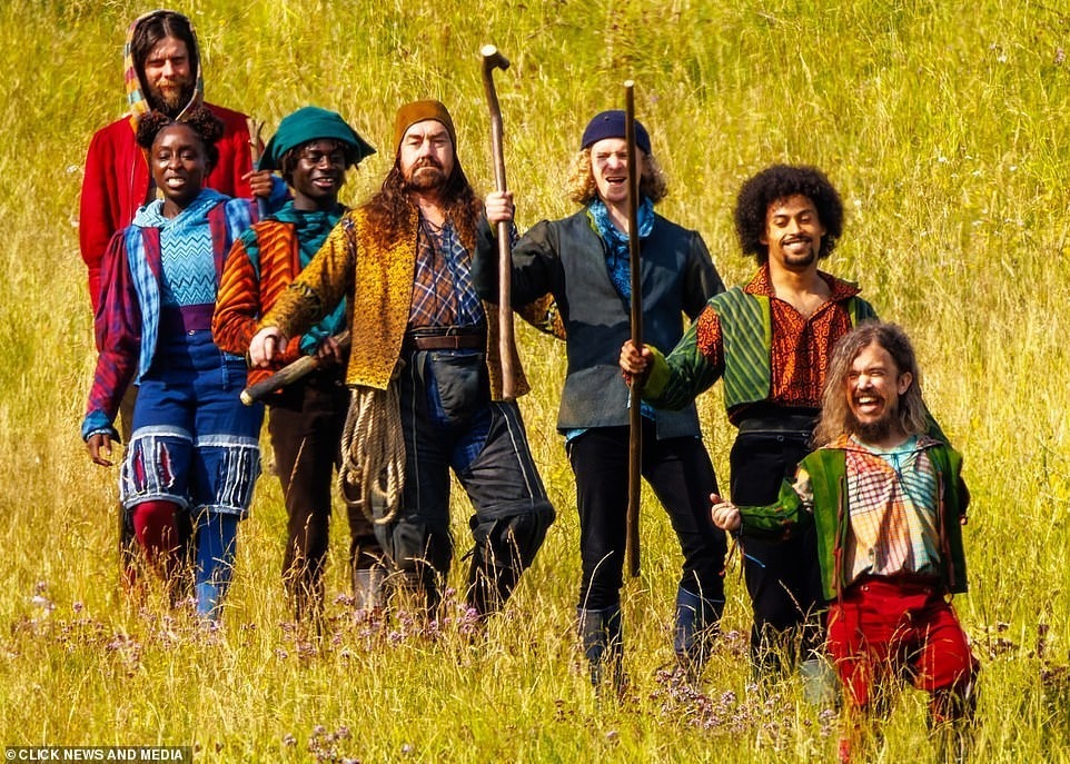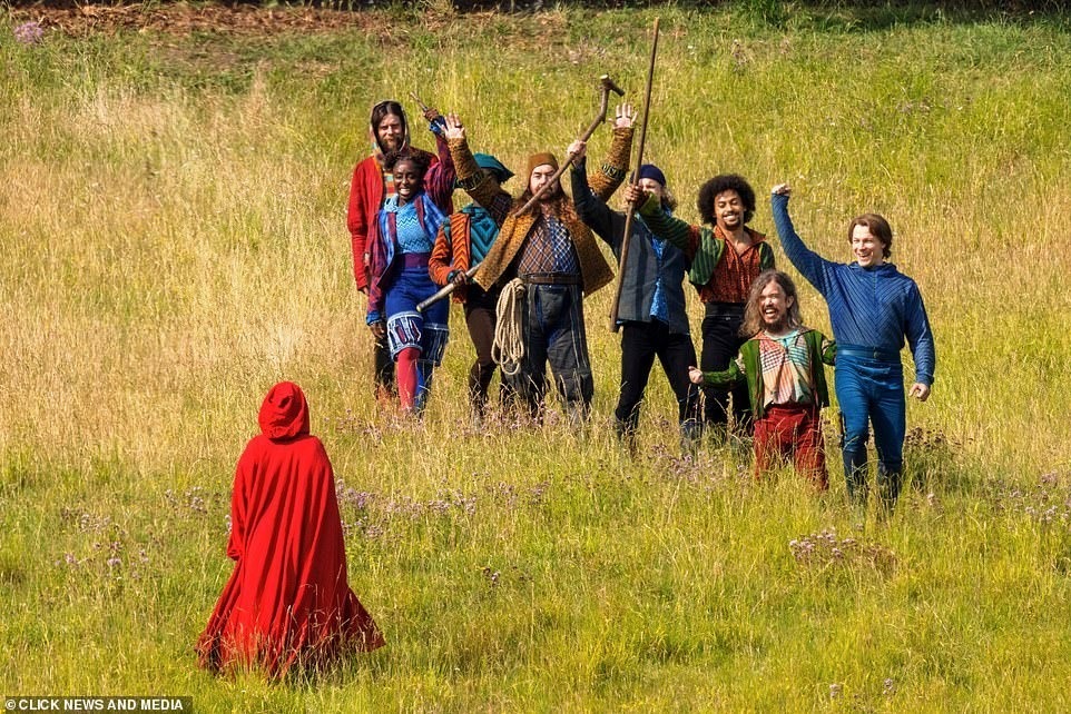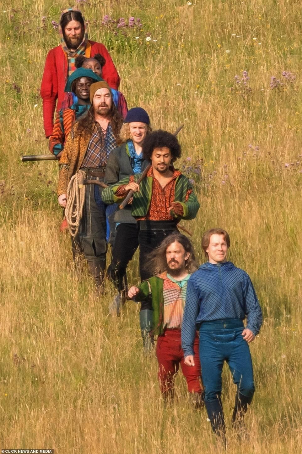 这些角色穿着不同风格的服装,拿着各种工具,穿过一片田野后振臂高呼。