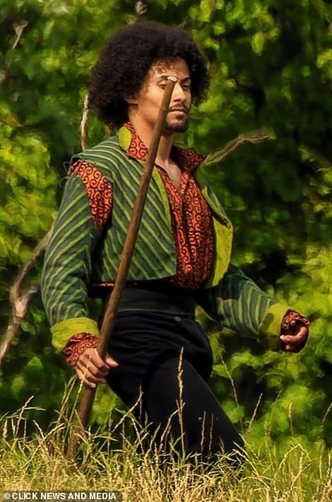 接下来的一名黑人男子穿着颜色鲜艳的服装,手里似乎拿着一根棍子;
