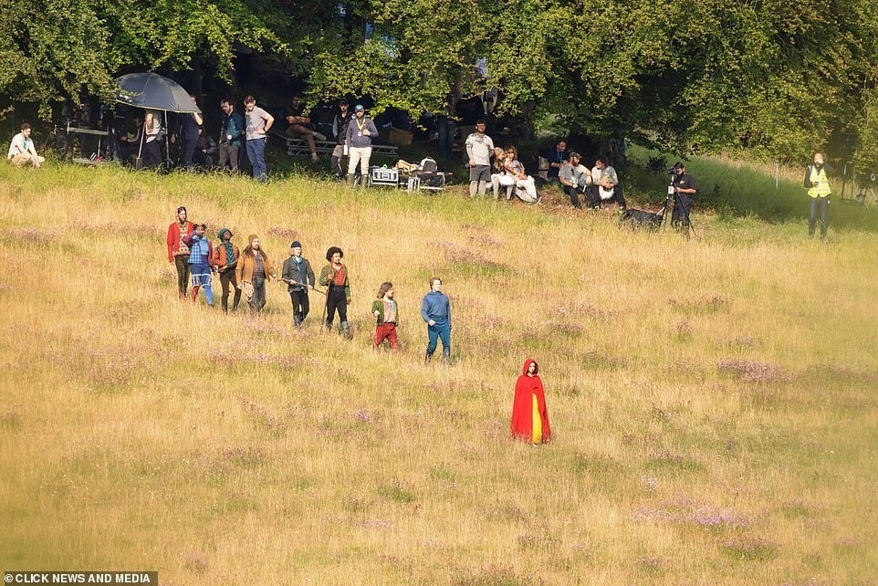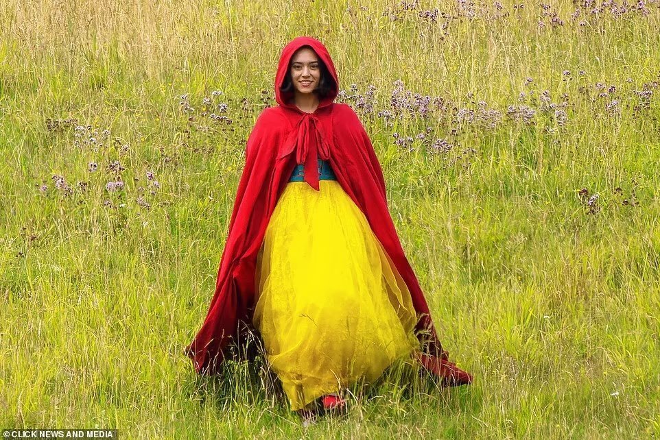 根据路透的照片来看,“打扮成小红帽”的白雪公主走在前面,8名不同性别、不同种族和身高的角色跟在她的身后。