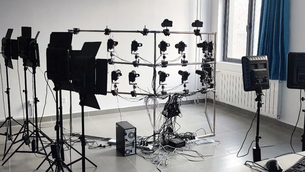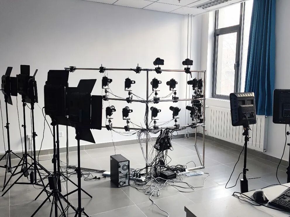 基于运动恢复结构 (Structure from Motion,SfM)的人脸三维重建技术[1]是指从不同的角度拍摄运动中的人物,捕获一组或多组二维人脸图像,捕获设备如图2所示,通过计算机视觉和机器学习的方法,恢复出三维的人脸模型。基于SfM的人脸三维重建的基本思想是利用图像之间的对应关系,通过几何原理和优化算法,求解出相机参数和三维点坐标,从而实现从二维到三维的转换。基于SfM的三维重建技术主要包括以下几个步骤: