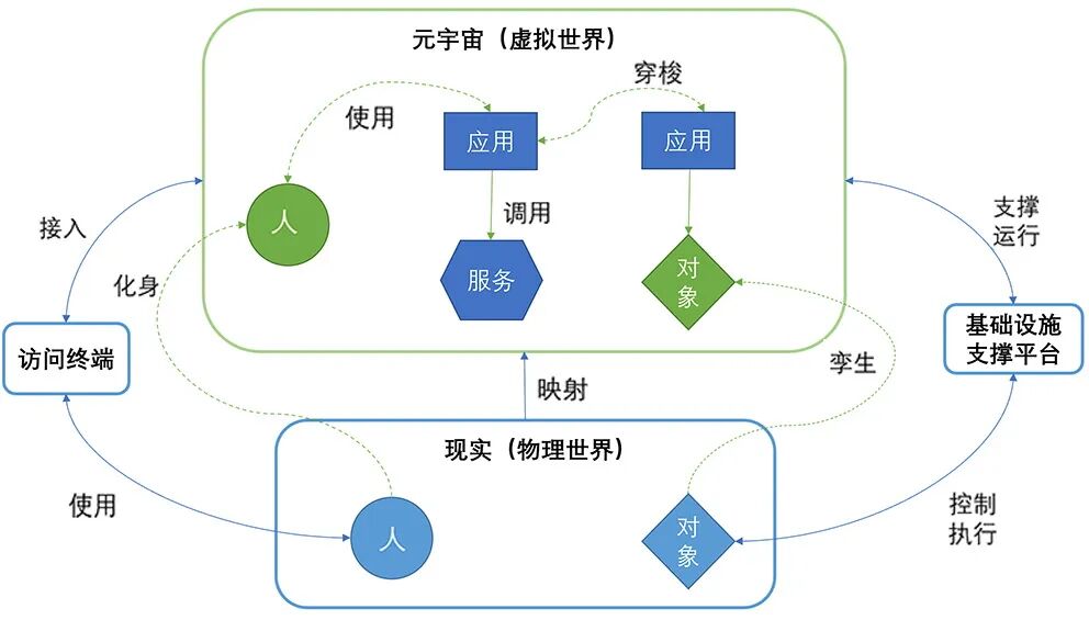元宇宙的概念是科幻小说《雪崩》第一次提出的,如今我们描述的元宇宙是一个高度沉浸且永续发展的三维时空互联网,是与现实世界映射和交互的虚拟世界(图1)。