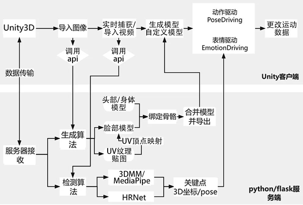 该架构基于Unity实现,并利用flask搭建web端,其中Unity主要提供用户界面,web端实现数字人生成和驱动算法。该架构能同时完成生成和驱动的任务。
