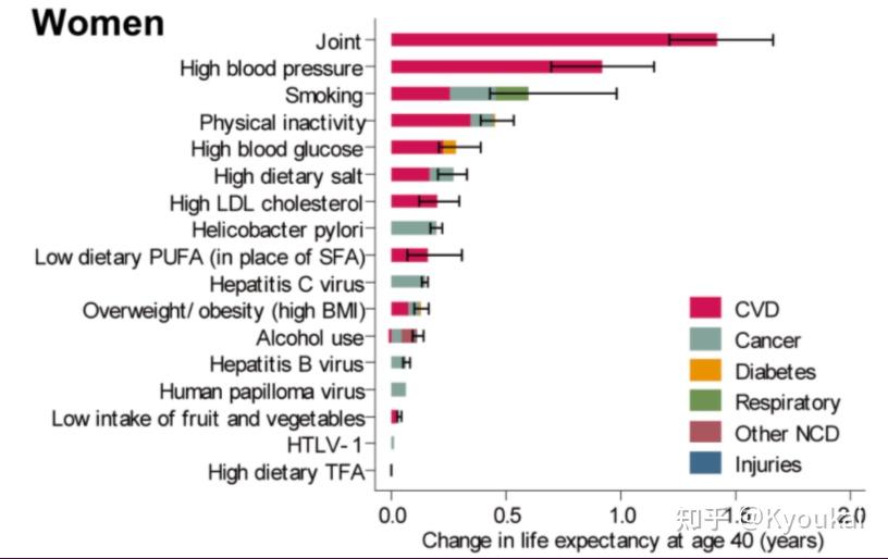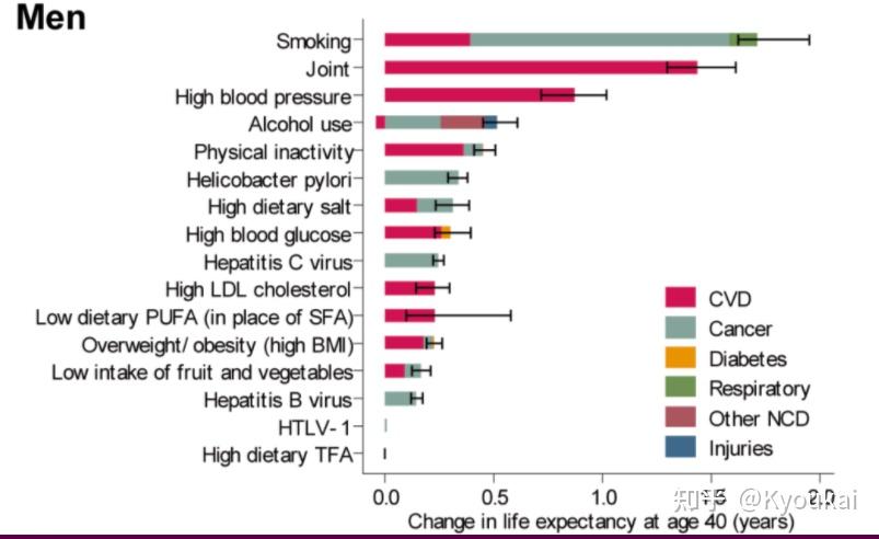 而且日本人寿命长主要说的是女性寿命特别的长,男性寿命没有高到那种程度,按照归因来说的话,健康的风险因素跟中国人也差不了很多、主要还是抽烟、高血压、运动之类的: