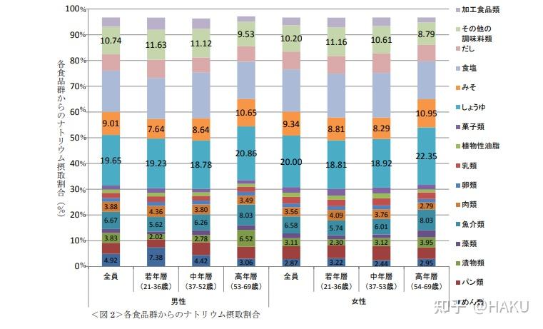 女性盐分摄取量:面类3%、面包5%、漬物3%、鱼介类7%、酱油20%、味噌9%、食盐16%等[4]