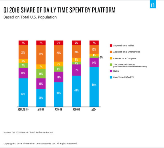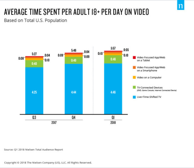 尼尔森的统计报告来自于2018年第一季度,考虑到美国人每天花费在听、看、阅读以及媒体互动上累计11小时的结论,这一结果占据了相当大的比例。