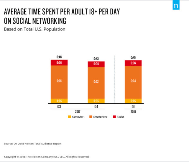 除了视频,尼尔森的报告还研究了社交媒体的普及情况。研究显示美国成年人每天平均花费在社交媒体上的时间为45分钟,其中大部分的使用平台是智能手机。