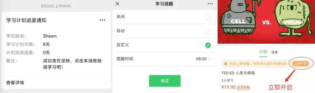 1组团学习,互相监督为了鼓励大家学习,他们推出了“会员专属群”模式。和一群志同道合的伙伴一起学习,不仅能互相交流,提高学习效率,还能自我监督。2暖心的课程更新提醒和每日学习提醒此外,「医课」还设置了“课程更新提醒和每日学习提醒”的功能。在平台开启每日学习提醒,每天都会收到医课公众号的暖心学习提醒,当然如果你怕错过专栏更新怎么办,那么点击立即开启那么你也会收到专栏提醒。