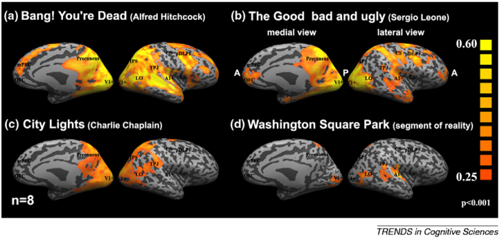 不同受试者观看不同电影时,脑区神经激活的分布情况,来源:10.1016/j.tics.2009.10.011