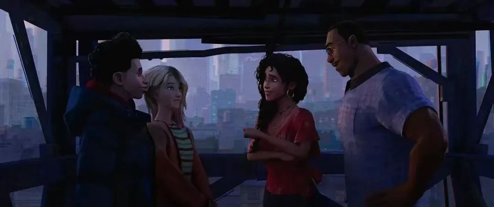 在为了视效倾尽心血之余,编导或许没明白,真正能发挥出影像敏锐触感的,是片中那些“慢下来”的时刻:格温和迈尔斯倒挂在天台一角,互诉衷肠;格温在充满情绪性暗示的水彩卧室里,跟父亲相拥和解……它们都使影片从无休止的跑酷中暂时抽离了出来,沉入对人物细腻内在的凝视和描绘。