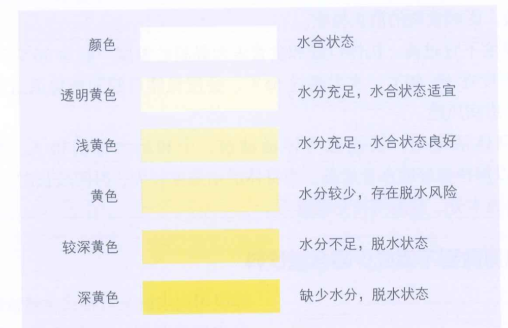 水分摄入充足时,正常的尿液颜色为透明黄色或是浅黄色。当尿液颜色加深,呈现黄色时,人体可能摄入水分较少,存在脱水状态;呈现较深黄色和深黄色时,提示人体水分不足或缺少水分,处于脱水状态。