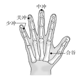 操作:用指甲或牙签掐关冲穴,每次掐10秒,放松2秒后重复掐按,每侧手指掐按5次。掐按时用力要均匀,使穴位能够感到微微酸痛。