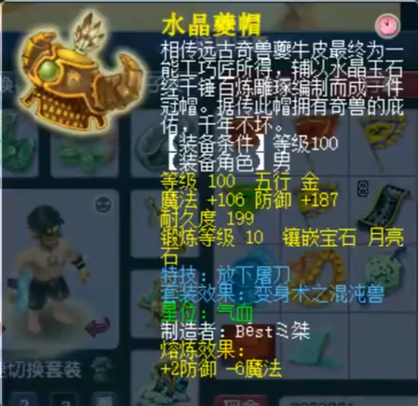 他在头盔部分选择了一件100级放下、混沌头。这件装备熔炼后防御高达189点,属于PK、任务都能用的特技装备。