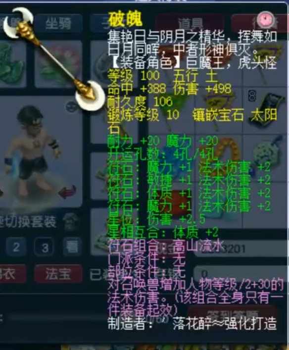 武器部分也非常不错,这是一把初伤418,总伤(不含命中)498,耐魔双加40点的小极品武器,这种武器也可以说是除了无级别之外最优的选择了。