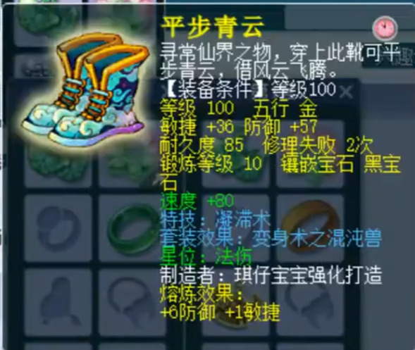 鞋子部分为100级凝滞、混沌,这件装备泛用性相当不错。毕竟,天地有时候也会使用流云、凝滞来抢速度,这个特技明显可以帮个小忙。