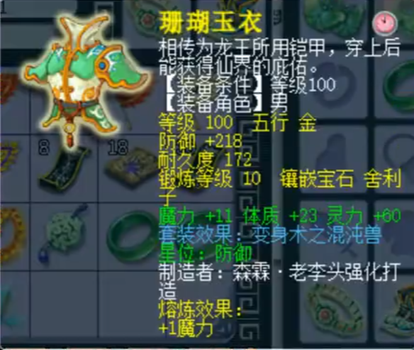 衣服部分非常极品,是一件初防218、体魔双加35点的混沌衣服。这种防御的衣服即便放到现在的神威市场,也足以傲视群雄。