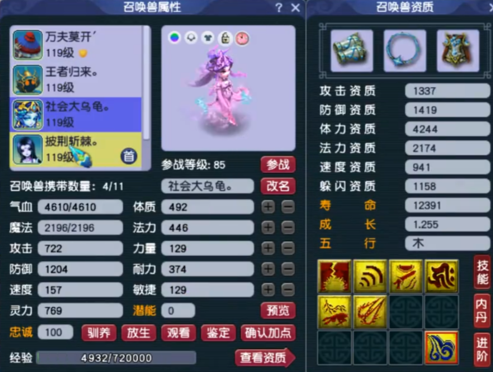 第四只召唤兽为9技能高连画魂,资质、成长都相当给力,也是目前主流的天地高连宠。