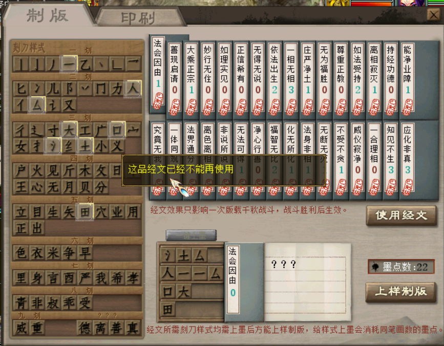 击退第二关后,还不算完,只要身上还有墨点,就可以去进行第三关,当然,如果没墨点了,不能雕刻“法会因由”经文,是没办法继续进行的,第三关规则是在一百回合内,拼出小怪们提出的文字,正常情况下大概有60道题目。当然非正常情况下,一回合也许可能会结束战斗,就看大力输出够不够狠了,没有金刚钻,于是一心选择了前者。这关也是神秘隐藏任务的最后一关,结束后,便不可以再次使用经文“法会因由”。以上就是版载千秋活动中,神秘任务的全部内容,和大家分享到这里了,更多精彩内容,我们下期再会。