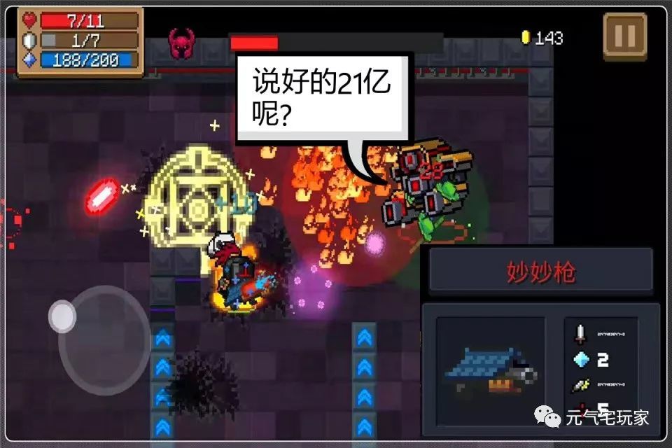 在《元气骑士》中,妙妙枪是一把可随机释放攻击模式的红武,所以并没有固定的伤害指数反馈。而在新版本中它的攻击属性虽然与前者相同,但是实际伤害仍然没有达成21亿的超额数值。看来这两种武器的“逆天级”属性,又是凉屋大大手下的一种全新特性,毫无可信度。