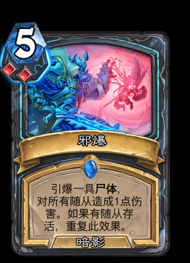 比如“邪爆”就是在大多数玩家眼里非常还原的一张卡牌,原本的技能是可以利用尸体对于周围所有敌人造成暗影伤害,而在炉石里面效果是引爆尸体对所有的随从造成一点伤害,如果还有随从存活就重复此效果。